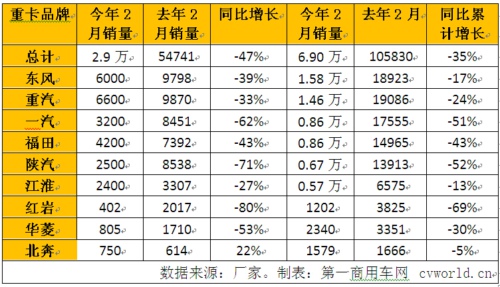 具體來看,2月份,東風(fēng)、重汽和一汽分別銷售6000輛、6600輛和3200輛,降幅為39%、33%和62%,一汽重卡下降尤為慘烈;福田和陜汽2月份銷車4200輛和2500輛(陜汽重卡民品約2300輛),分別下滑43%和71%;第六名江淮銷售重卡2400輛,同比下降27%,華菱、上汽依維柯紅巖分別銷售重卡805輛和402輛,降幅為53%、80%;北奔銷車750輛,同比增長22%,雖然是這幾家重卡企業(yè)中唯一正增長的企業(yè),但基數(shù)太小,對市場的貢獻(xiàn)度頗微。
