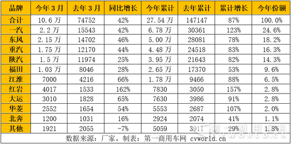 具體來看,排在3月份重卡市場銷量排行榜榜首的企業(yè),仍然是一汽解放,其3月銷量達到2.2萬輛,同比增長42%;東風重卡排在第二,3月份銷車2.15萬輛,同比增長46%。第三名中國重汽,3月份銷售1.75萬輛重卡,同比增長44%。陜汽重卡銷量突破1.5萬輛,同比增長25%;福田銷售重卡突破1萬輛,同比上漲28%。江淮汽車銷售重卡7000輛,同比增長66%;上汽紅巖超過大運,躍升月度第七,達到4017輛;大運、華菱和北奔分別銷車3010、2552和1200輛。