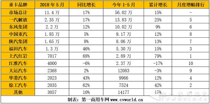 今年1-5月,重卡市場(chǎng)累計(jì)銷售56.02萬輛,比去年同期的48.61萬輛上漲15%。銷量前十企業(yè)中,八家企業(yè)都實(shí)現(xiàn)了正增長(zhǎng),其中上汽紅巖累計(jì)增速最大,達(dá)到79%;其次是徐工,累計(jì)增幅為42%;增速排第三的是一汽解放,1-5月同比增長(zhǎng)25%。