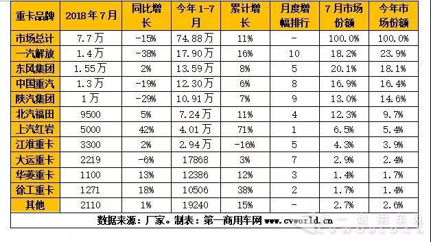 2018年7月和前七月主流重卡企業(yè)銷量一覽表(單位:輛)