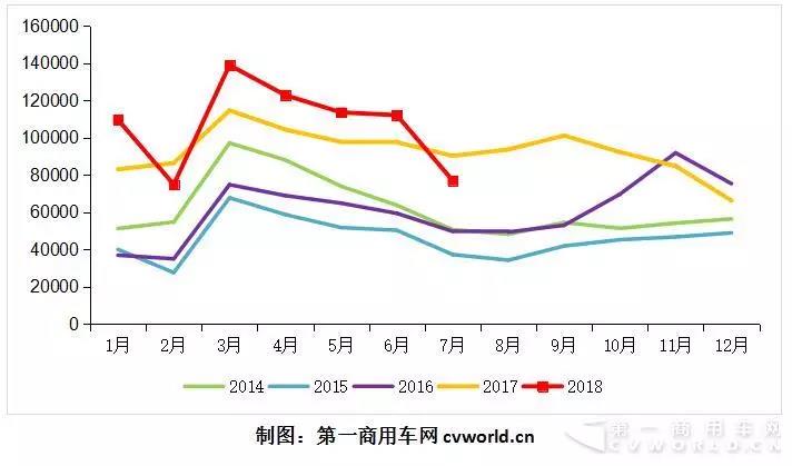 2014-2018年1-7月重卡市場月度走勢圖