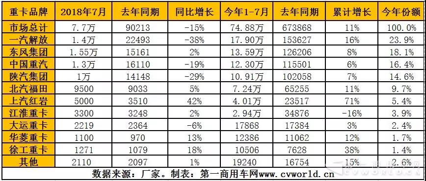 從今年3月份就躍居行業(yè)第六的上汽紅巖,7月份銷售重卡約5000輛,同比增長42%,繼續(xù)保持了行業(yè)前六地位以及快速增長的態(tài)勢;今年1-7月,紅巖累計銷售各類重卡4.01萬輛,同比上漲71%,市場份額5.4%。第七名江淮格爾發(fā)7月份銷車約3300輛,同比增長2%,今年前七個月累計銷售2.94萬輛,市場份額為3.9%。