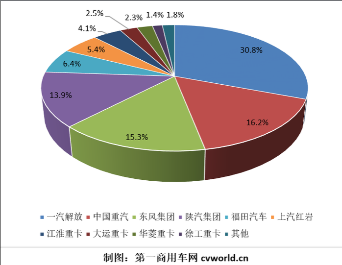 根據(jù)第一商用車網(wǎng)掌握的數(shù)據(jù),今年2月份,行業(yè)第一名依然是“老大哥”一汽解放,其當(dāng)月銷售重卡2萬輛,同比基本持平;1-2月,解放重卡累計(jì)銷售5.34萬輛,同比下滑2%,市場(chǎng)份額達(dá)到30.8%。