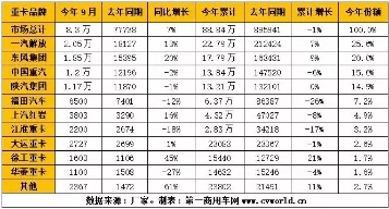由于今年7、8、9月份的重卡市場(chǎng)銷量連續(xù)保持增長(zhǎng),因此,前三個(gè)季度的重卡市場(chǎng)累計(jì)銷量保持了小幅下降的態(tài)勢(shì)。1-9月,我國(guó)重卡市場(chǎng)累計(jì)銷量為88.84萬輛,比上年同期的89.59萬輛只下滑了1%。