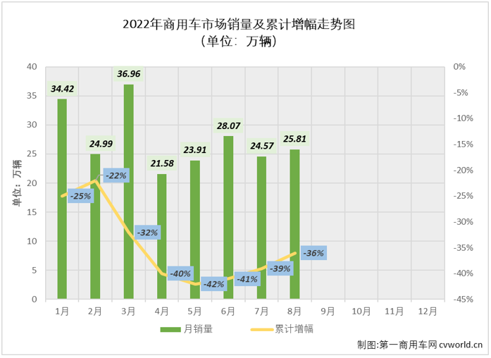 25.81萬輛在商用車市場里算什么水平的表現(xiàn)?翻看歷史數(shù)據(jù)我們不難發(fā)現(xiàn),2月份、7月份和8月份正是商用車市場較“低產(chǎn)”的月份,最近8年,商用車市場銷量在2月份有7次不足30萬輛,7月份有6次,8月份則有4次。縱觀近五年8月份商用車銷量及增幅走勢圖可見,近五年8月份的商用車市場走出一個增-降-增-降-增的趨勢。從數(shù)字上看,今年8月份商用車市場僅銷售25.81萬輛,顯然處于低位,但卻并不是最低,5年最低位是2021年8月份的24.69萬輛。今年8月份25.81萬輛的表現(xiàn)與5年最高位的2020年8月份相比,有超17萬輛的差距,還不足當月銷量的60%,與2018年及2019年8月份相比也至少有5萬輛左右的差距。因此,8月份商用車市場雖收獲了2022年的首次增長,但距前幾年的“正常水準”仍有較大差距,可以說,8月份的增長帶給市場的信心相當有限。
